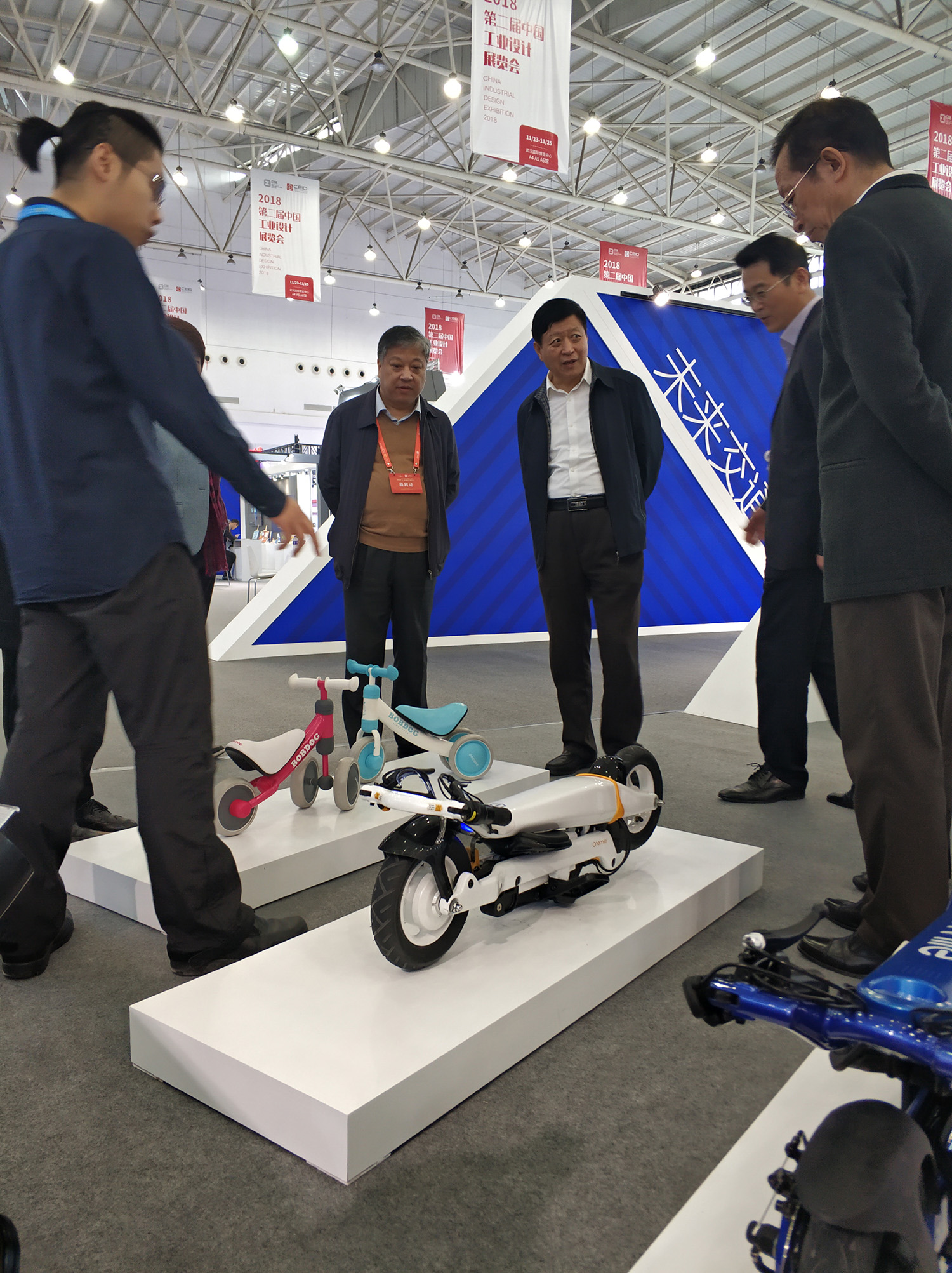 岸峰設(shè)計(jì)師為領(lǐng)導(dǎo)們講解榮獲“紅點(diǎn)之星”大獎(jiǎng)的光環(huán)電動(dòng)折疊車